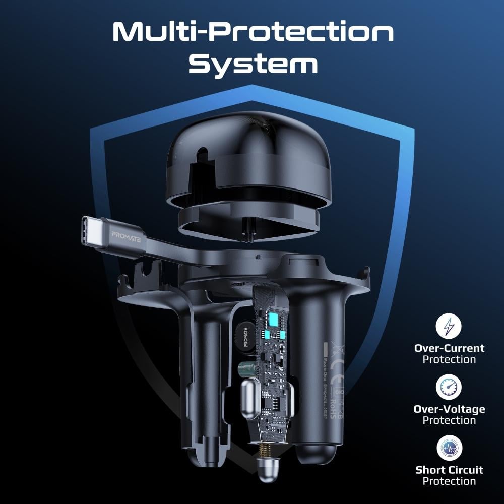 شاحن السيارة المدمج PowerDrive-RC65 من Promate، الذي يقدم راحة وسرعة غير مسبوقة. بفضل مخرج طاقة يصل إلى 62 واط، يحتوي الشاحن على منفذ USB-C وتقنية الشحن السريع Qualcomm 3.0 لتشغيل أجهزتك بسرعة وكفاءة. يتميز بكابل USB-C بقدرة توصيل طاقة قابل للسحب بقوة 45 واط، يصل طوله إلى 80 سم، مما يسهل استخدامه دون تشابك. يناسب تصميمه الصغير والأنيق داخل أي سيارة، بينما يوفر نظام الحماية المدمج ضد الحرارة الزائدة، الماس الكهربائي، وزيادة التيار، مما يضمن شحنًا آمنًا في جميع الأوقات. مع تصميمه العصري وأدائه الممتاز، يعد PowerDrive-RC65 الرفيق المثالي لرحلاتك، ليبقي أجهزتك مشحونة وجاهزة في كل مكان.