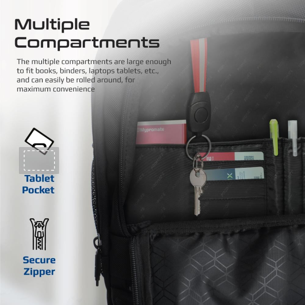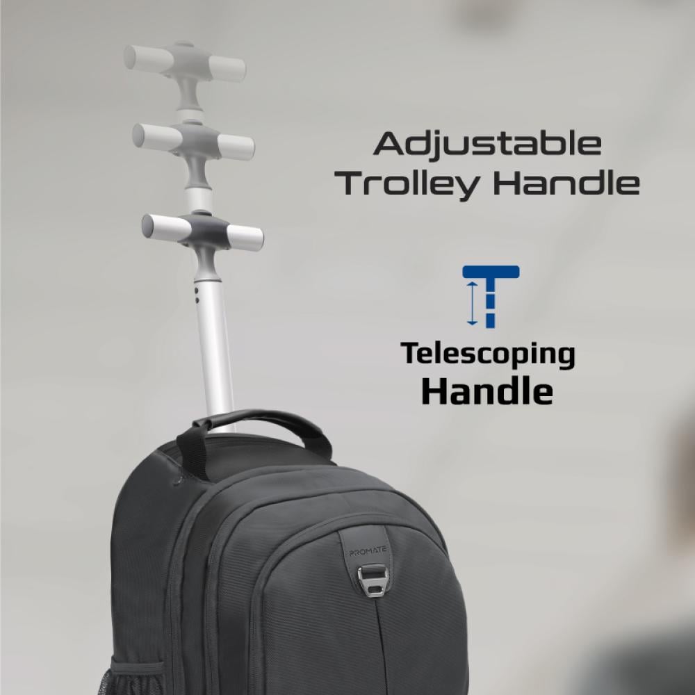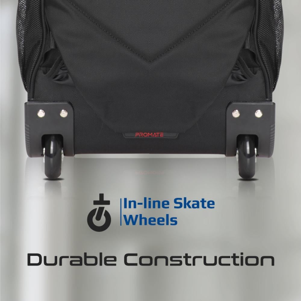 عجلات بهيكل متين: تتميز حقيبة الظهر Promate Compact-TR بعجلات قوية ومتينة، مما يجعلها الاختيار الأمثل للمسافرين الذين يفضلون الراحة وسهولة التنقل.