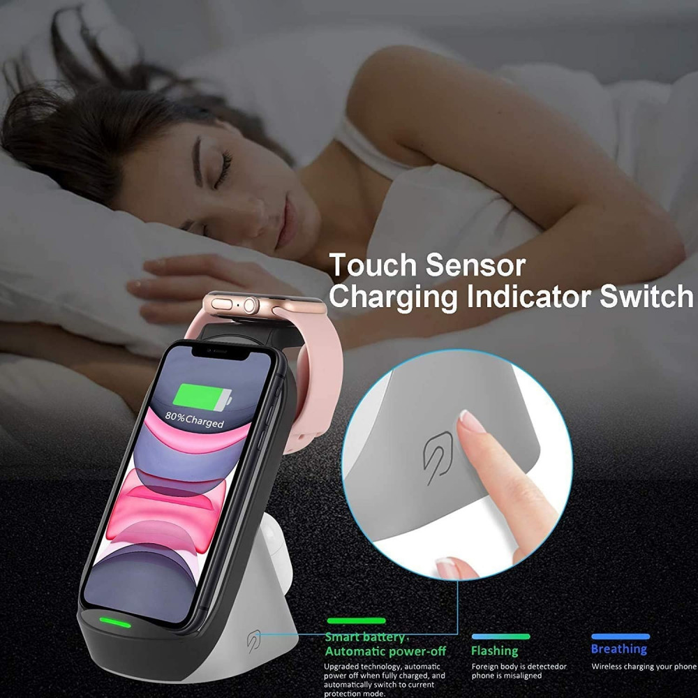 شاحن لاسلكي سريع متعدد الوظائف وقاعدة وقوف، شاحن لاسلكي 3 في 1 مع شاحن لاسلكي Qi-معتمد مع شاحن لاسلكي 15 واط لهواتف ايفون وسامسونج وهواوي والساعات الذكية