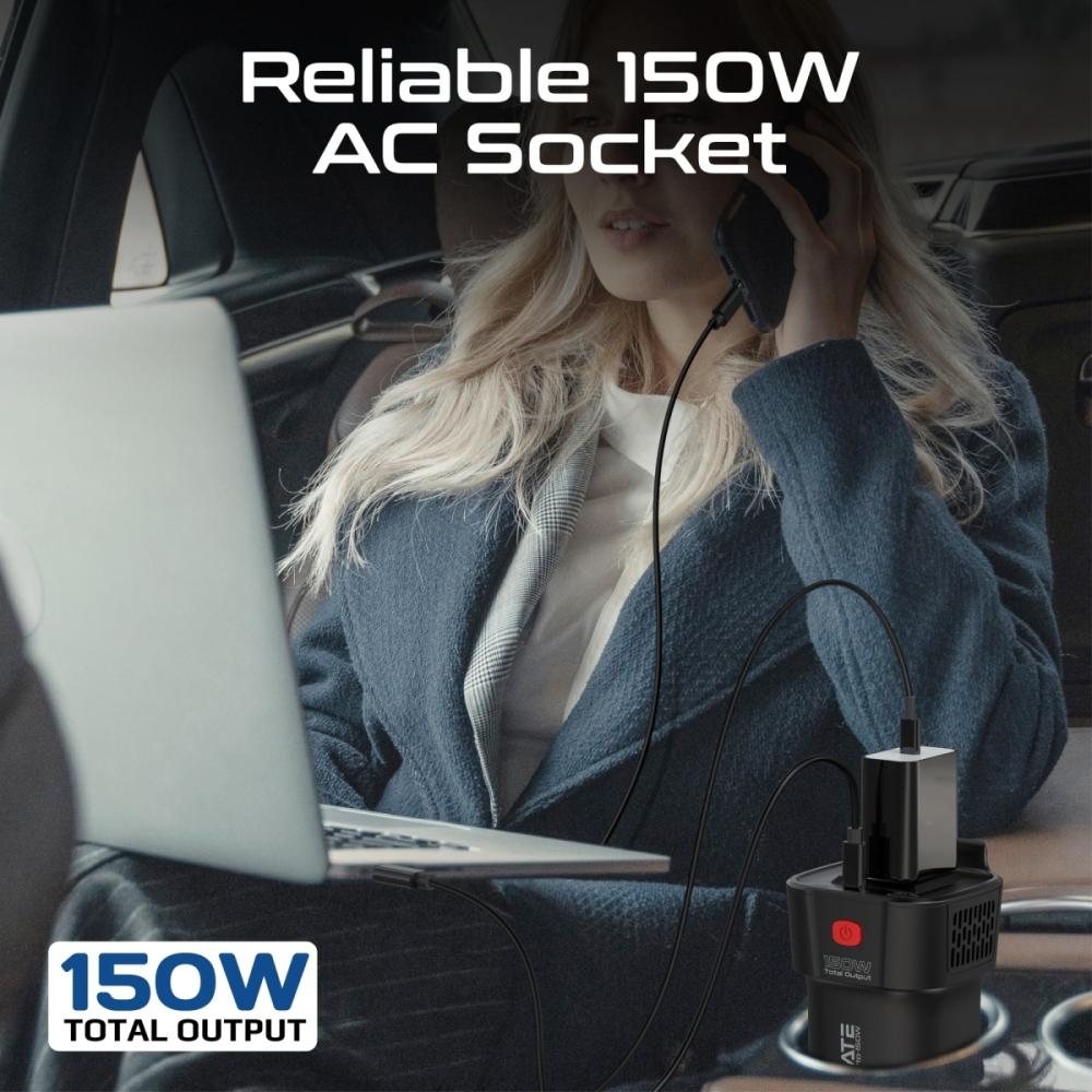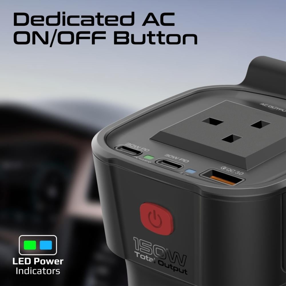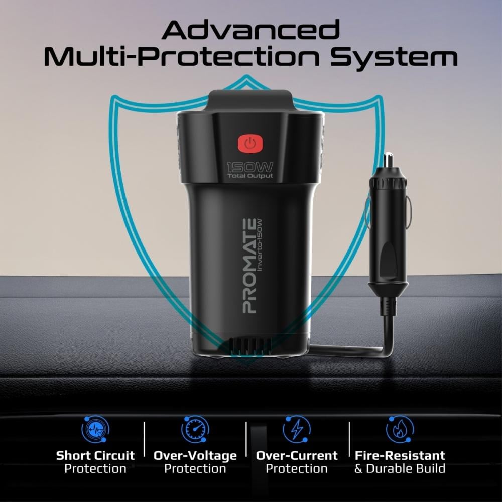 استمتع بشحن سريع وآمن مع محول طاقة للسيارة Inverto-150W من بروميت، مزود بمنافذ متعددة تشمل تيار متردد 150 واط، USB-C مزدوج بقوة 30 واط، ومنفذ USB-A سريع، مع حماية متكاملة وتصميم مدمج يناسب حامل الأكواب في سيارتك.